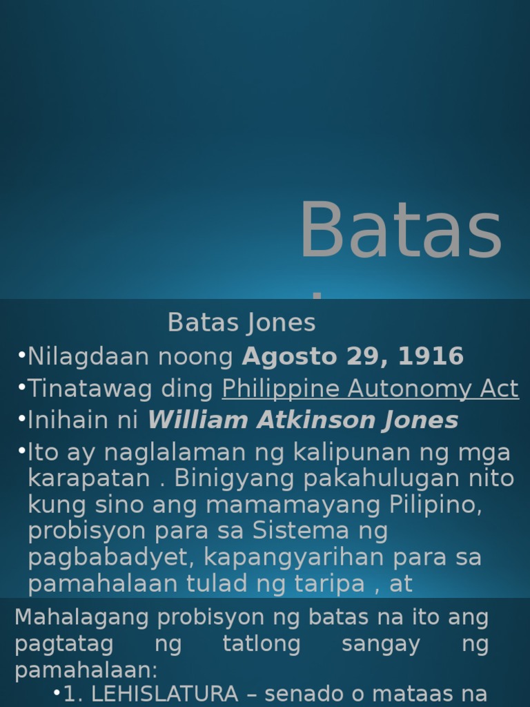 Ano po and kahulugan ng Batas Jones 1916Tagalog po please. Ang Philippine Autonomy Act of 1916 upang maging kilala bilang ang Batas Jones ay dinisenyo sa pamamagitan ng mga Kinatawan William Atkinson Jones Virginia Estados Unidos ng amerika at nasabatas noong ika-29 ng agosto 1916Ayon sa paunang salita ng Batasay dapat na kinuha mula sa u. Ano po yung mga likas na yaman sa gitnang asya.