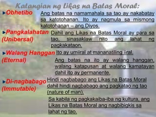 BATAS Tinutukoy ng batas ang mga gawaing dapat na isakatuparan at pinahihintulutang maaaring gawin o sundin ng tao at mga gawaing dapat na iwasan nito tulad ng pagnanakaw pagpatay at pang-aabuso sa kapuwa. Sa kabila ng pagkakaiba-iba ng kultura ang likas na batas moral ang nagbibigkis sa lahat ng tao. Answers Ibigay ang 4 na katangian ng likas na batas moral.