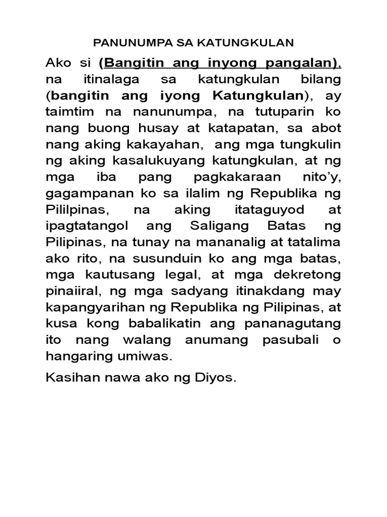 PANUNUMPA SA TUNGKULIN Ako si _____ ay inihalal sa katungkulan bilang _____ ay taimtim na nanunumpa na gagampanan ko nang buong katapatan ang tungkuling napaatang sa akin sa abot ng aking kakayahan. Saligang - batas o konstitusyon. Bukod sa mga ito nagkaroon din ng mga saligang.
